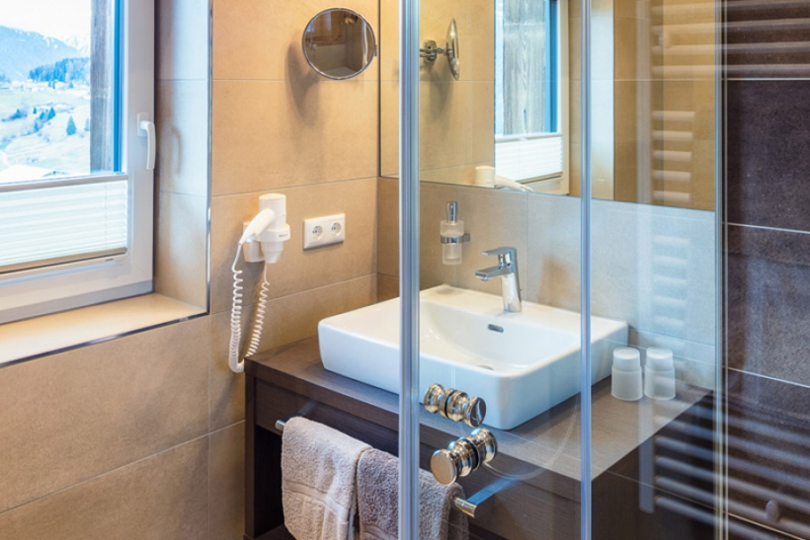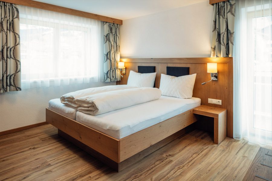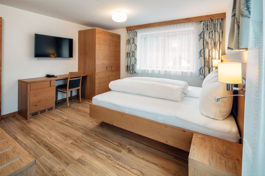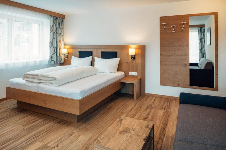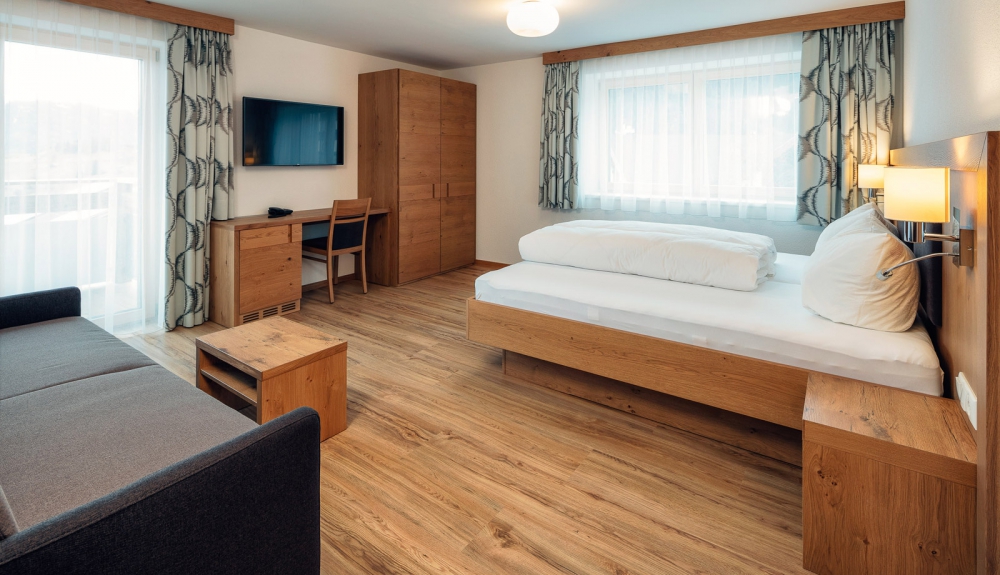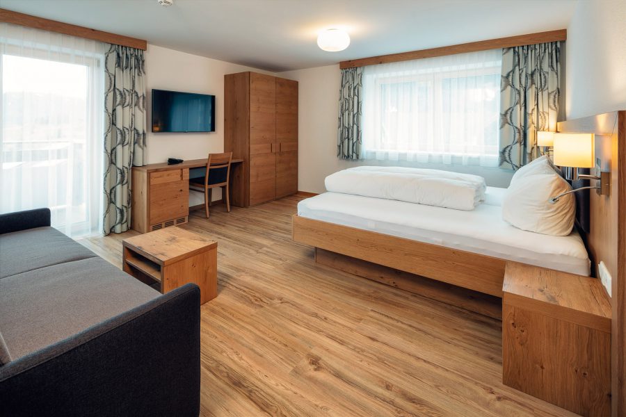 Das Komfortzimmer Almrose bietet mit seinen 33 Quadratmetern besonders viel Platz. Dieses Zimmer hat einen südseitigen Balkon, der Sonnenbäder mit einmaligem Ausblick garantiert. Ebenfalls zeichnet sich das Zimmer durch einen großzügigen Nassbereich mit getrenntem WC aus.